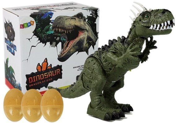 Tyranozaur Rex posiada duże łuski na szczycie głowy, które świecą na różne kolor. Atutem też jest duża czaszka, a także masywną, muskularną budowę,  wielkie śnieżnobiałe zęby. Zieleń połączona z elementami czarnego i wszystkie dodatki, łuski , długie pazury sprawią, że mamy wrażenie, że dinozaur jest prawdziwy! Dinozaur przemieszcza się w przód, rusza głową, górnymi kończynami, otwiera i zamyka paszczę, wydając dźwięk ryczenia oraz porusza tułowiem w prawo i lewo. Znoszenie jaj to kolejna jego zaleta!  W zestawie znajdują się 3 sztuk, wrzucamy je przez otwór na grzbiecie i obserwujemy, jak jaja zostają znoszone od spodu podczas ruchu. Po włączeniu gada wyświetla się zdjęcie prawdziwego tyranozaura, projektor znajduje się na klatce. Możemy poznać tajemnicę wyglądu prawdziwego dinozaura. To nie lada przygoda dla twojego dziecka.