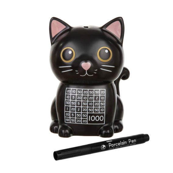 Ta czarna skarbonka w kształcie kota to nie tylko stylowa dekoracja, ale też doskonały motywator do odkładania pieniędzy. Na jej froncie znajduje się plansza - wykreślanka, w której każde pole odpowiada konkretnej kwocie. Po jej wpłaceniu można je wygodnie skreślić dołączonym czarnym markerem do porcelany. Dzięki temu w prosty i czytelny sposób widać postępy w oszczędzaniu. Gdy wszystkie pola są zamalowane - osiągnąłeś swój cel - w skarbonce masz 1000 zł.