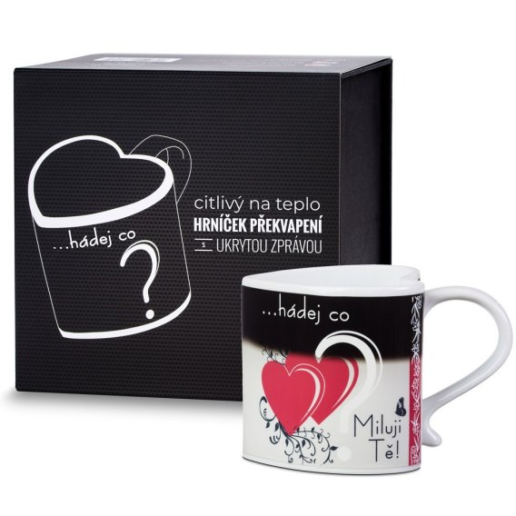 Nadruk wokół całego produktu. Gotowy do wręczenia na prezent bez konieczności dodatkowego pakowania. Napis na produkcie: Hádej co? Miluji tě! Produkt w czeskiej wersji językowej.