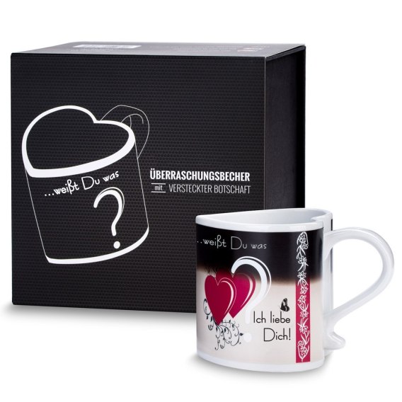 Zaskakujący Kubeczek Deluxe to termoaktywny kubek w kształcie serca z ukrytą wiadomością, zapakowany w eleganckie pudełko prezentowe. Na pierwszy rzut oka, wszystko, co na nim widać, to pytanie Wiesz co? umieszczone na czarnym tle. Kiedy wlejesz do kubka gorący napój, jego wygląd całkowicie się zmieni. Czarna farba stopniowo zaniknie, odsłaniając serca i napis Kocham Cię.