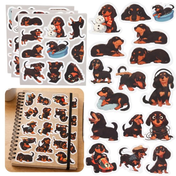 Zestaw naklejek z jamnikami to urocza propozycja dla dzieci i dorosłych, którzy lubią kreatywne dekorowanie oraz zwierzęce motywy. Każda naklejka przedstawia jamnika w innej odsłonie, co sprawia, że zestaw jest różnorodny.